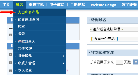 在菜单中选择“列出所有产品”,您会看到您注册的域名全部列表,然后选择要进行dns解析设置的域名,进入下一步