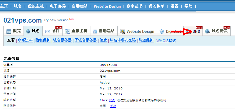 完成第5步后,成功更新到我们的域名服务器,会显示上图中下划线效果。然后再点“管理DNS”,进入第7步。