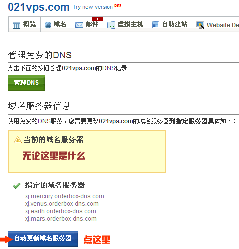 无论“当前域名服务器”是什么,在这里点击“自动更新域名服务器”将域名服务器更新为我们的域名服务器,更新成功后会看到“第6步”的界面/结果。