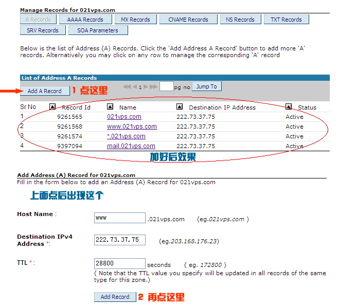 然后点“Add A Record”,出现上图下半部分,添加好要解析的域名前缀和要解析到的IP地址后,再点“Add Record”即可。